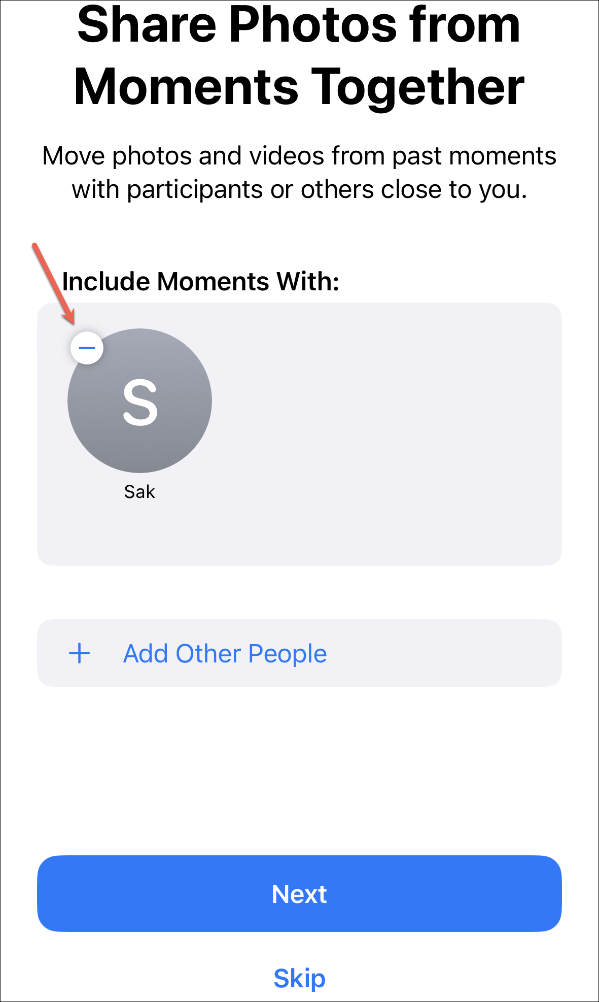 But if you chose the second option, on the next screen, you’ll be asked to choose the people. iOS will automatically include people you’re inviting to the Shared Library. But you can include other people or remove the ones iOS has included. To remove someone, tap the ‘–’ on their icon.