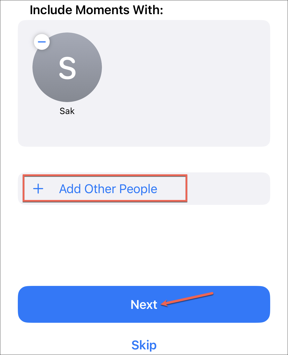 To add more people, tap ‘Add Other People’ and select the people from your Photos ‘People’ list. Then, tap ‘Next’.