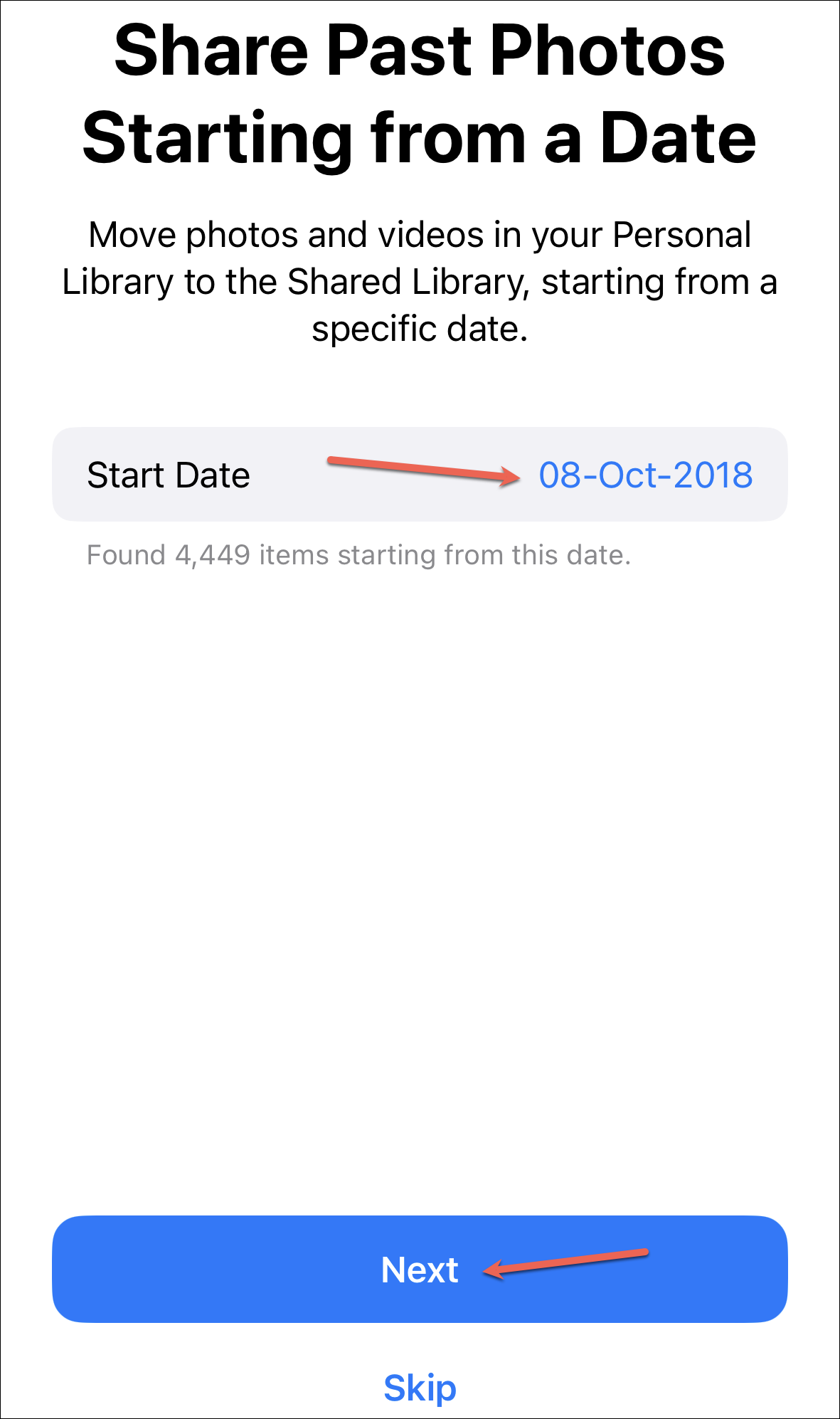 Then, on the next screen, choose the starting date after which all photos should be added to the library, and tap ‘Next’. Or, tap ‘Skip’ to not include photos based on a date.