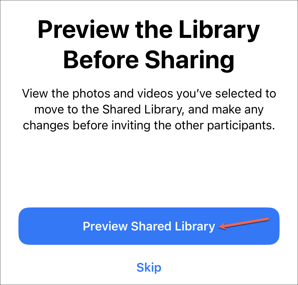 Also, choose the photos and videos you want to move from your personal library to the shared library, or tap ‘Move Photos later’ to skip the step right now. Then, preview the Shared Library (if you’re sharing content at this stage) and confirm.