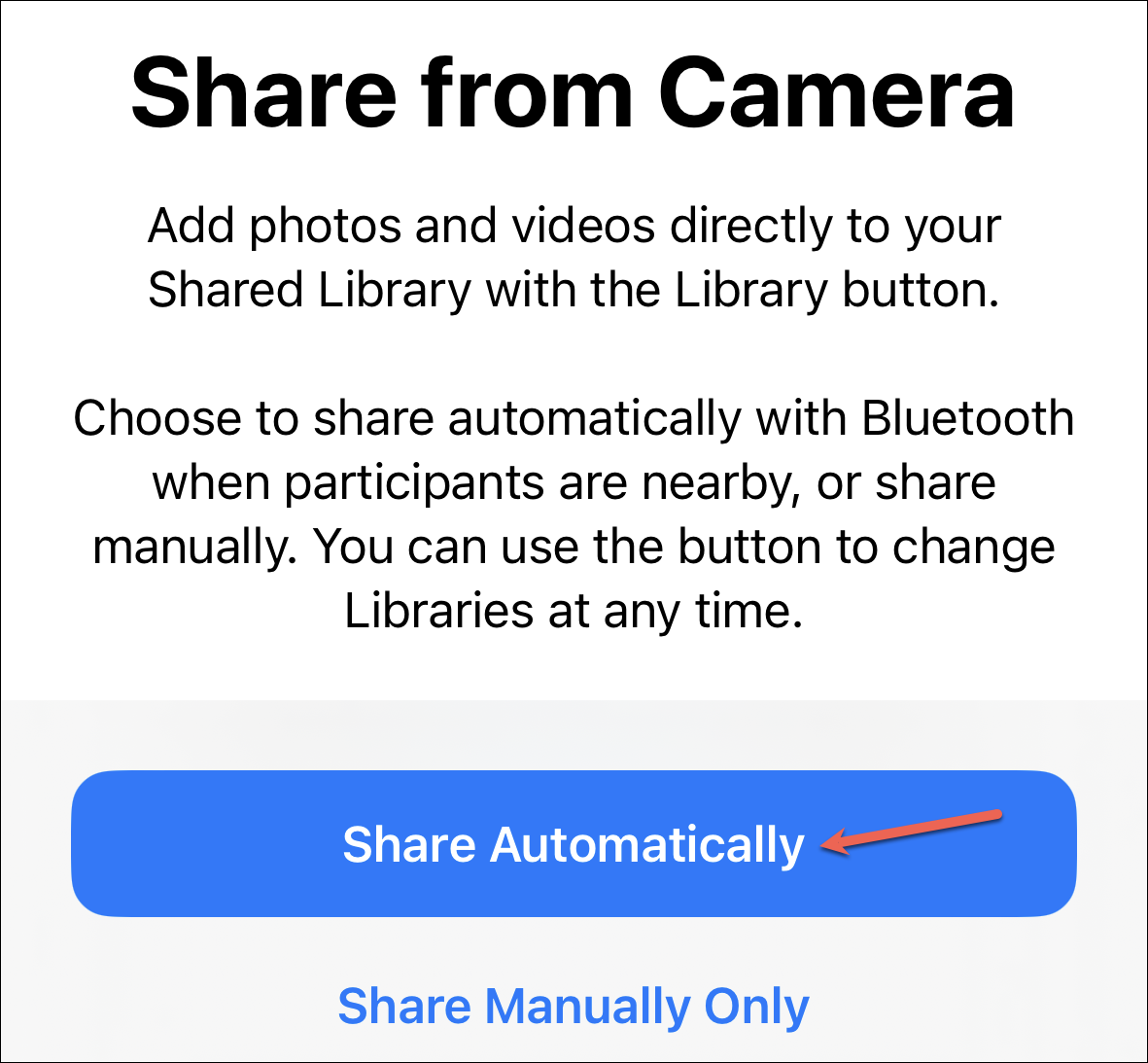 You can also add new photos and videos to your library automatically from the camera. Tap ‘Share Automatically’ to enable the Shared Library button in the Camera app. Otherwise, tap ‘Share Manually Only’. You can change these settings later. If you choose to share the photos automatically, it’ll do so when the participants of your shared library are nearby (detected by Bluetooth) when you’re taking photos.