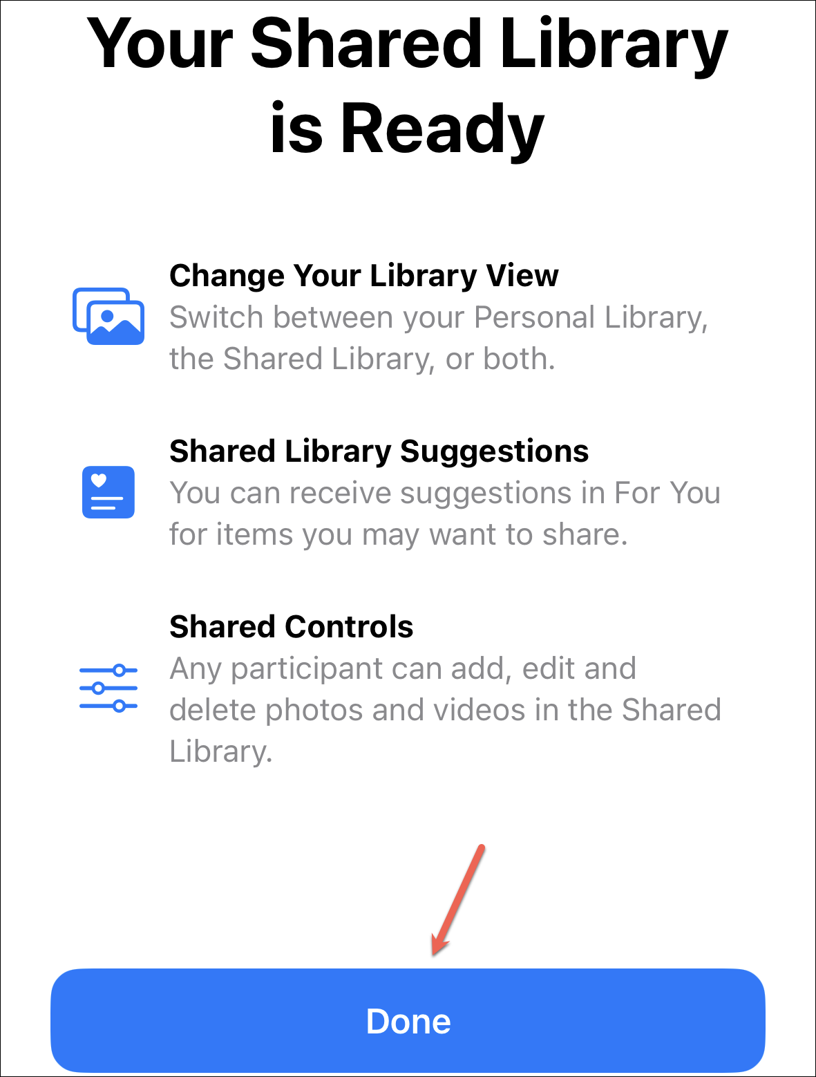 Your Shared Library is finally set up. Tap ‘Done’ to close the setup screen. The Photos app will open automatically.