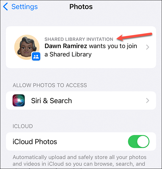 You can also go to ‘Photos’ from the Settings app and find the invitation there. Tap the invitation in the Settings app to join it.