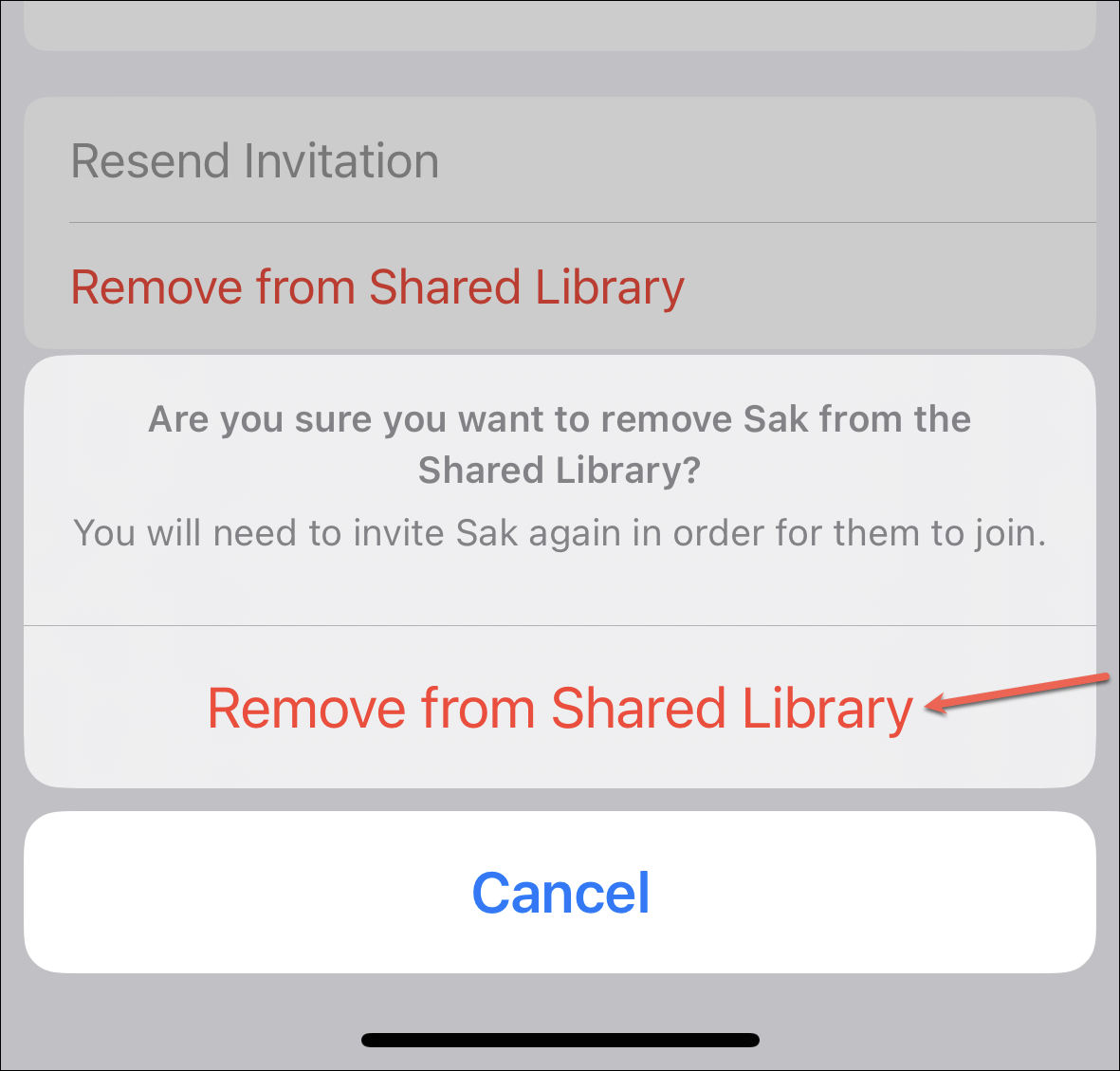 A confirmation prompt will appear. Tap ‘Remove from Shared Library’ again to confirm.