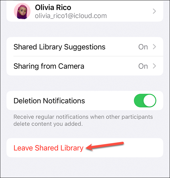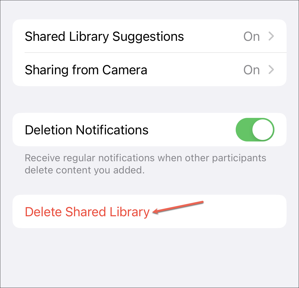 The library creator can also delete the library at any time. From the Shared Library option in the Photos settings, tap the ‘Delete Shared Library’ option at the bottom.