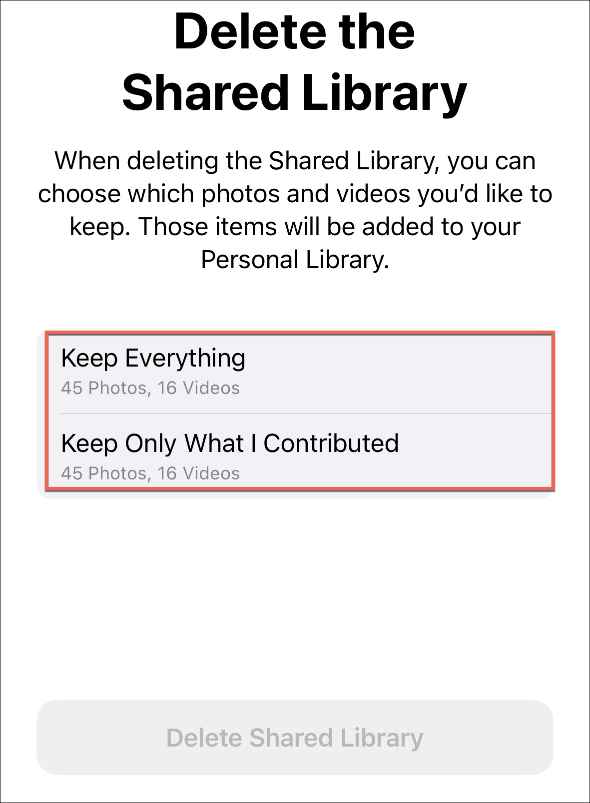 Then, choose whether you want to keep everything from the shared library in your personal library or only the content that you contributed. Tap the respective option to select it. Then, tap ‘Delete Shared Library’ to proceed.
