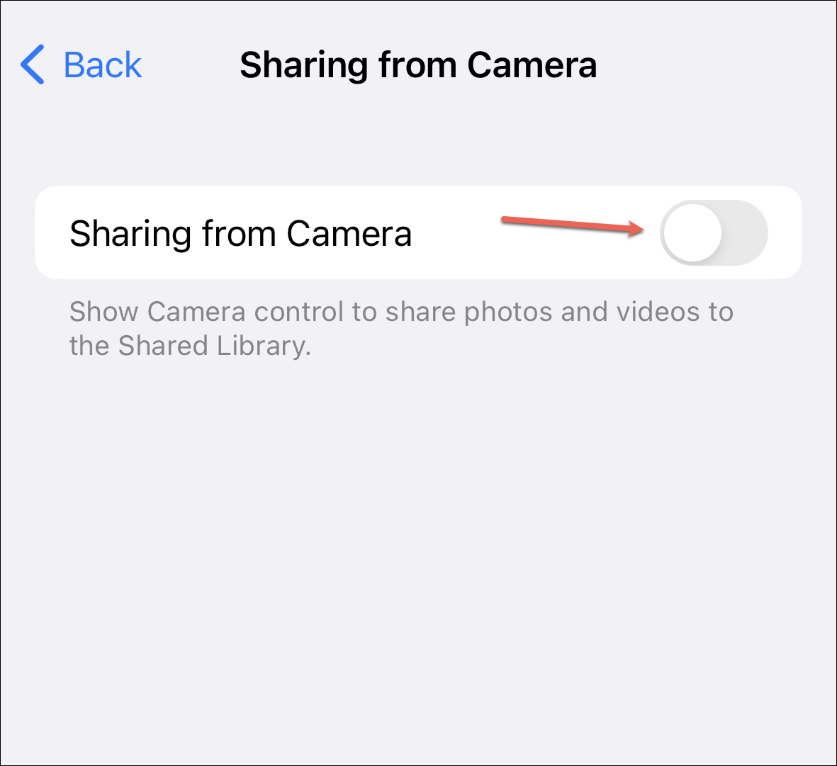 Although you get the option to share photos and videos automatically from your camera to the shared library during setup, you can change your choice later from the Camera app. You can also choose to share the photos manually while capturing them.