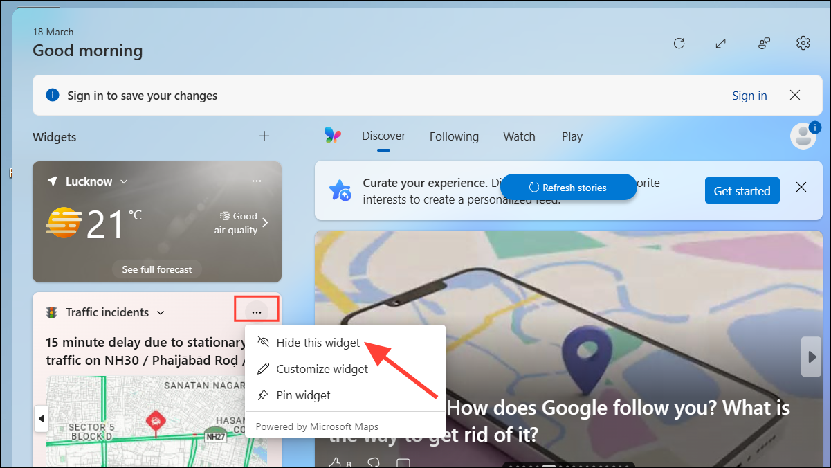 Step 2: Click the three-dot icon in its top-right corner and select Hide this widget from the dropdown menu. This will immediately remove the widget from your panel.