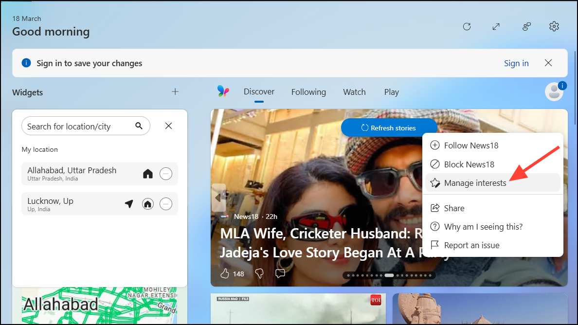 Step 1: Within the widgets panel, click the three dots on the top right of a widget and then click Manage interests.