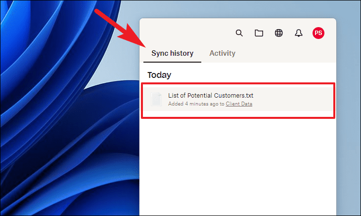 To view your sync history, click on the Dropbox icon in the taskbar and select the ‘Sync history’ tab. This section displays all recently synced files and folders.