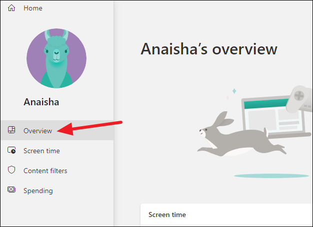 From the Microsoft Family app, click on your child's name to access their account details. The navigation menu on the left allows you to explore different features and settings.