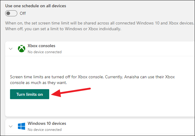 Step 3: To set limits for individual devices, ensure the toggle is off. Scroll down to the specific device and click 'Turn limits on'.