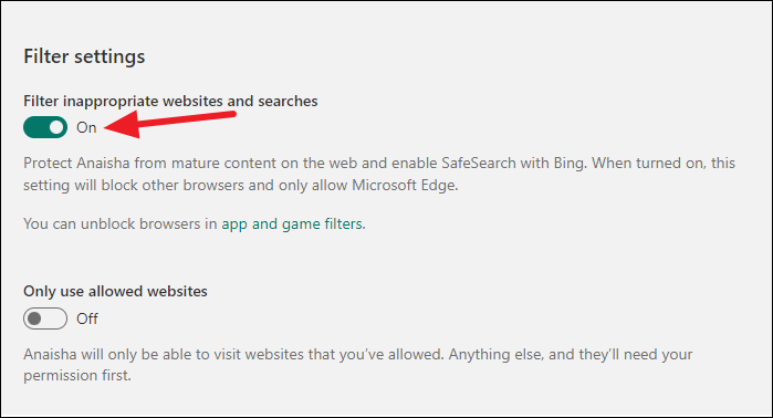 Step 2: Turn on 'Filter inappropriate websites and searches'. This restricts web browsing to Microsoft Edge, where Bing SafeSearch filters out mature content.