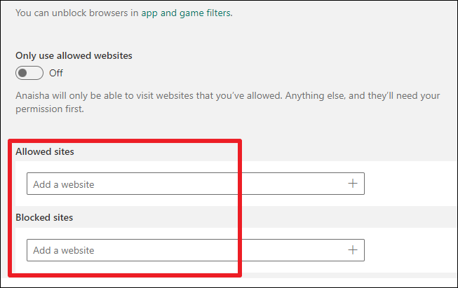 Step 3: Add specific websites to the 'Allowed websites' or 'Blocked websites' lists as needed.