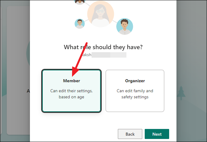 Step 3: Choose the appropriate role for the family member. Select 'Member' for your children or 'Organizer' for other guardians. For adding a child, select 'Member'.