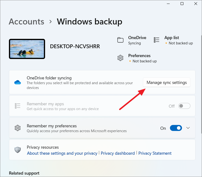 Step 2: In the Windows Backup settings, you can choose which folders, apps, settings, and credentials to back up. To specify the library folders you want to include, click on 'Manage sync settings'.
