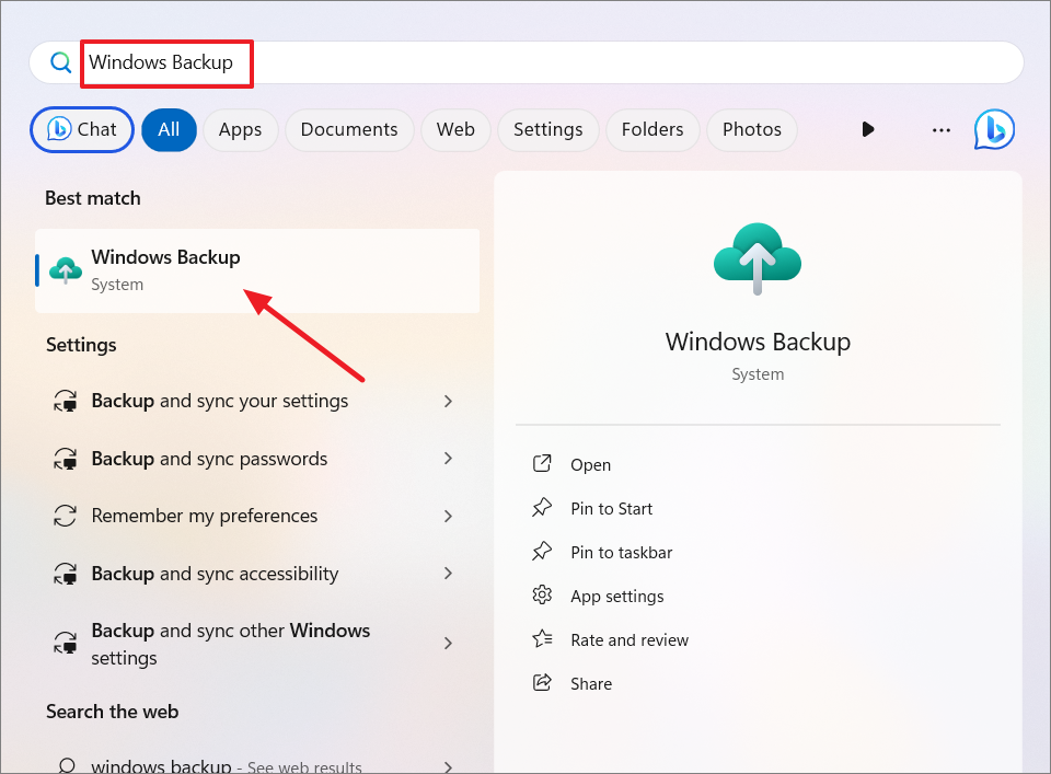 Step 1: Open the Windows Backup app on your PC. You can find it by typing 'Windows Backup' into the Windows Search bar and selecting it from the results.
