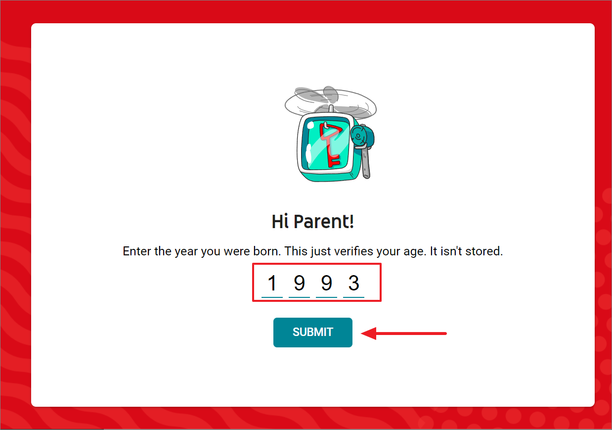 - Confirm you are a parent by entering your birth year and clicking 'SUBMIT' on the next screen.