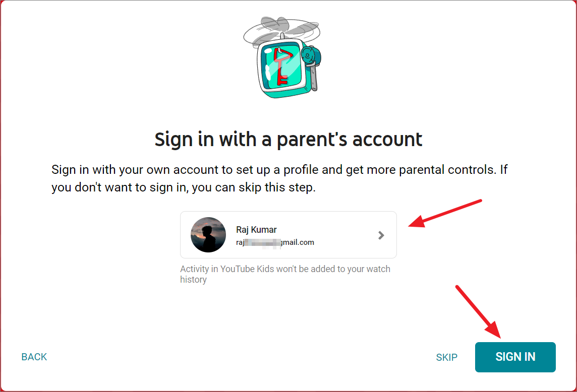 - You'll see a welcome message; tap or click the 'Next' button or the arrow button to continue. If your child has a supervised Google Account, they also use it to sign into the app. To sign in using the supervised Google account, click the second option below.