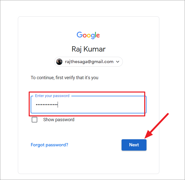 - Next, enter your Google account password, and click the blue 'Confirm' or the 'Next' button.