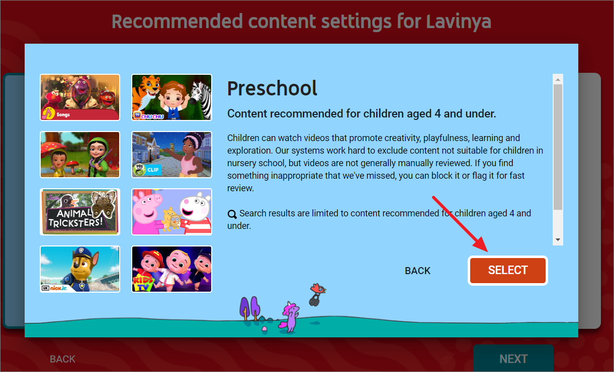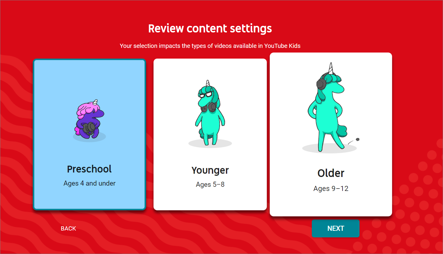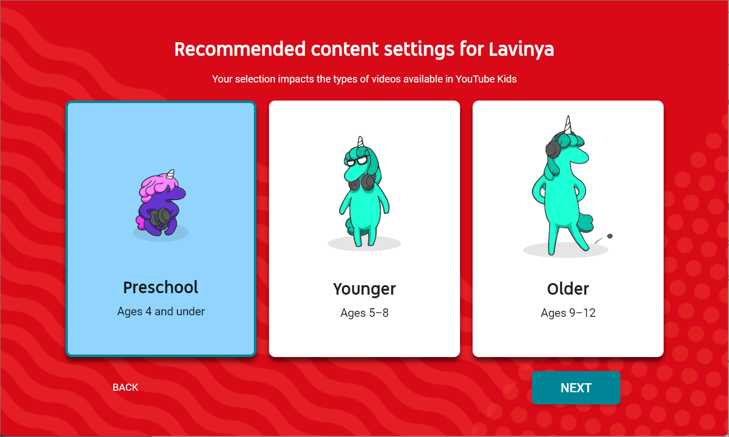 - Next, choose the appropriate age range and recommended content settings for your child by selecting the correct tab and tapping the 'Next' button or the next arrow. By default, the app will select the appropriate content setting depending on the provided age, but you can also change it if you want. If you are using the YouTube Kids app on your phone, you will have an additional option, called 'Approve content yourself', which allows you to approve individual videos, music, and channels that your child can watch.