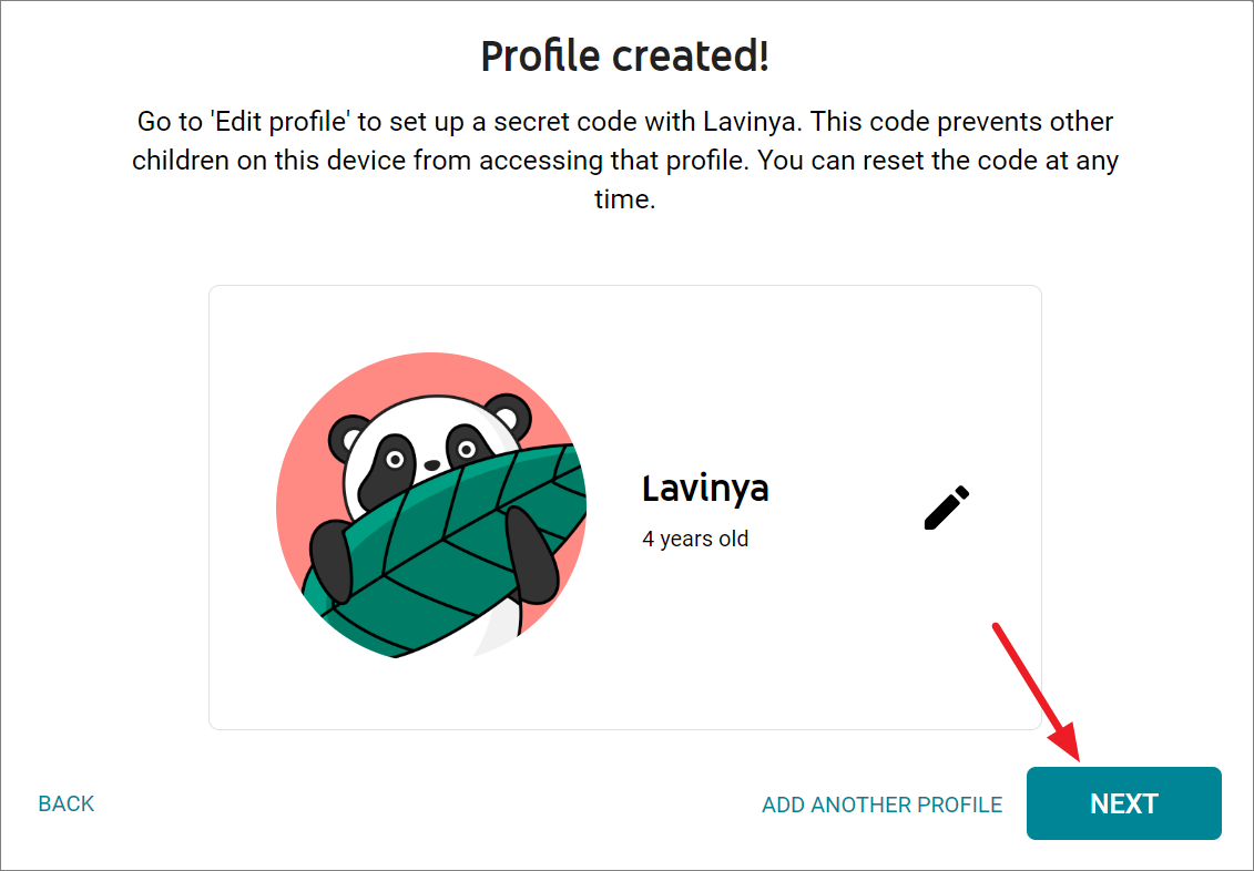 - You'll be notified that the profile has been created. If you want to make changes to the created profile, tap the pencil icon to edit it. Tap the 'next' arrow or 'NEXT' to continue. If you have more than one child, you can create additional profiles by selecting 'ADD ANOTHER PROFILE'.