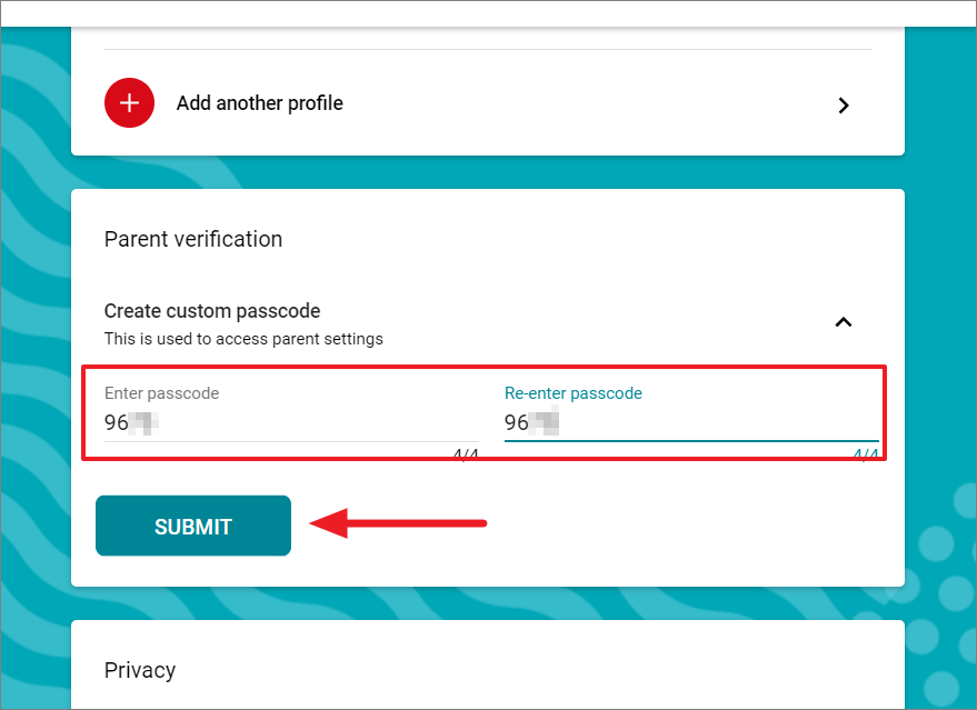 - Enter and re-enter your four-digit passcode and click/tap 'SUBMIT' to set the passcode.