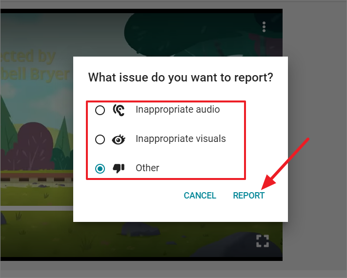 Then, choose one of the reasons for reporting including 'Inappropriate audio', 'Inappropriate visuals', or 'Other' reasons, and click on 'REPORT'.