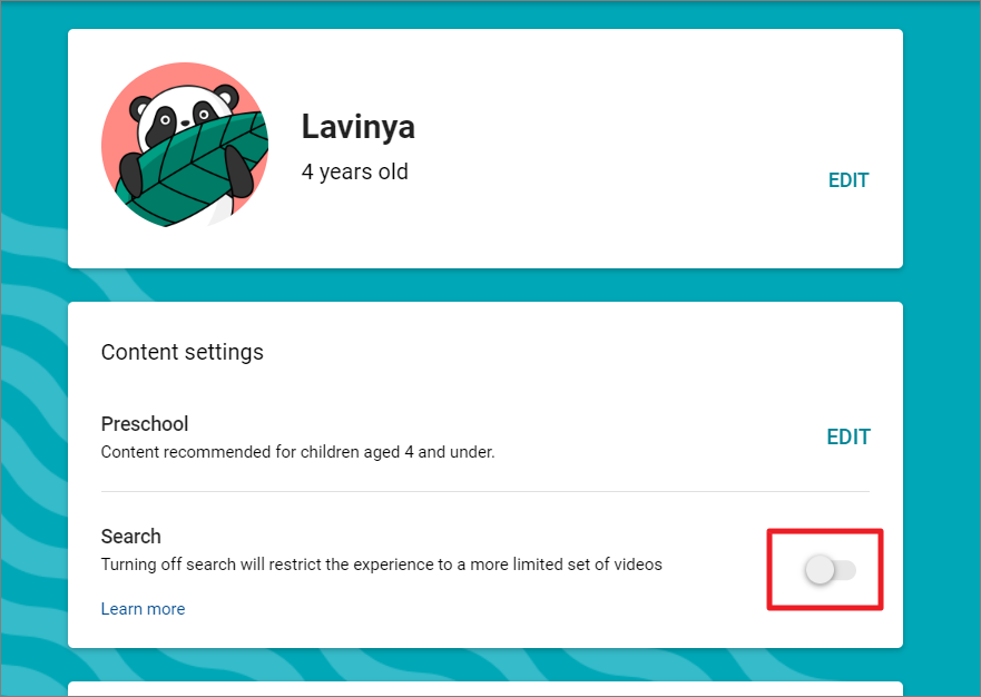 Turning off search prevents kids from exploring YouTube Kids on their own. If you enabled the search function when setting up the profile and now want to turn it off, you can do so by toggling off the switch next to the 'Search' option.