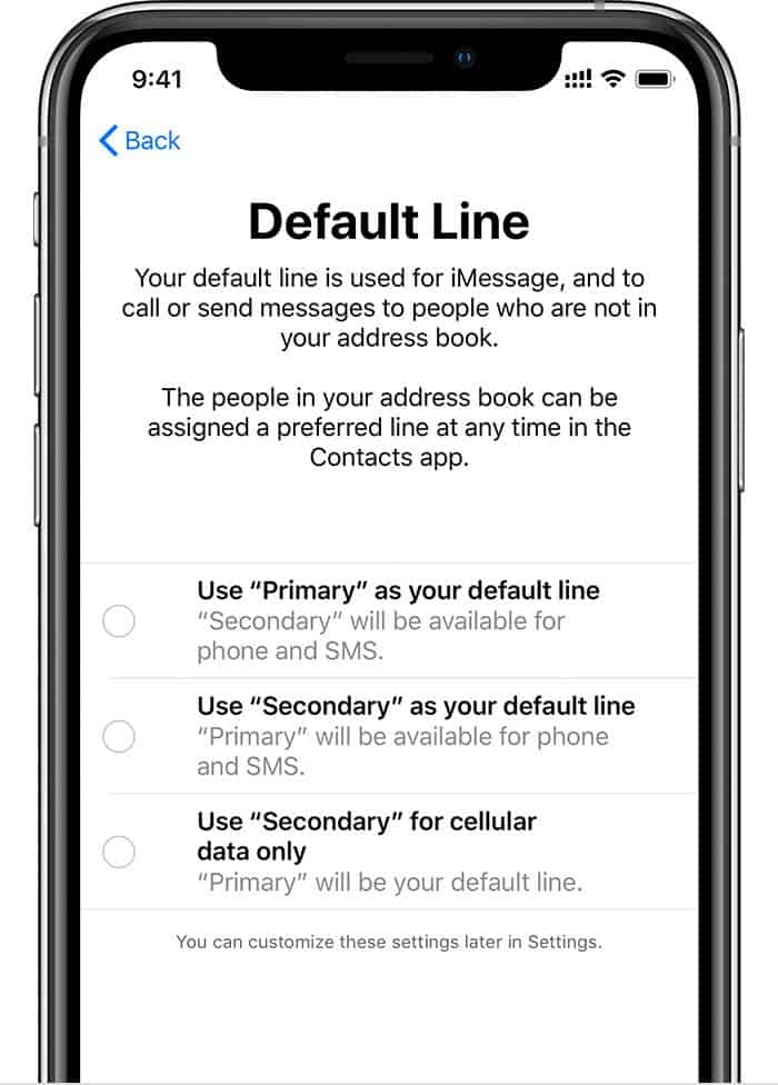 Use Primary as your default line: If you select this option, Primary will be used by default for voice, SMS, Data, iMessage, and FaceTime. The secondary will be available just for voice and SMS.