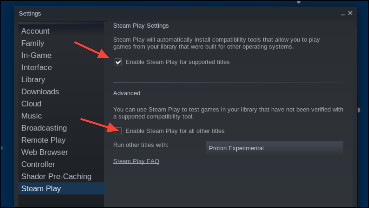 Step 2: Once Steam is installed, launch it and log in with your Steam account. Next, enable Proton to run Windows games on Linux. Navigate to Steam settings, select the "Steam Play" tab, and check both "Enable Steam Play for supported titles" and "Enable Steam Play for all other titles." Steam will usually default to Proton Experimental, suitable for most games.
