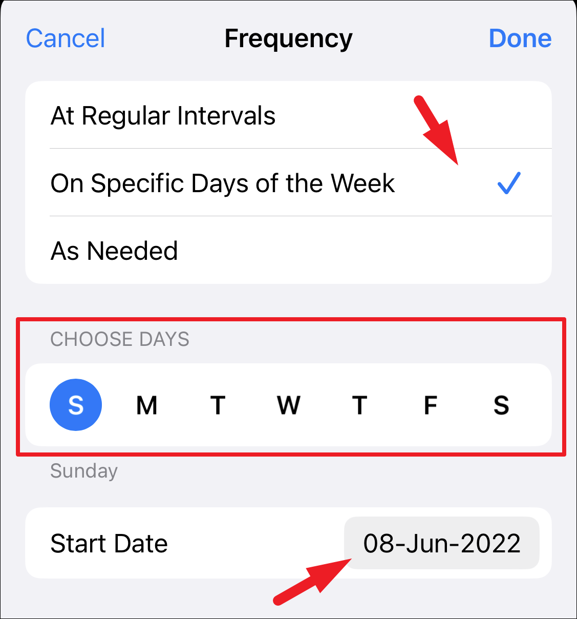 In case you have chosen the ‘Specific Days of the week’ frequency, select the days that you wish to be reminded of the dosage from the section. Then, select the starting date by tapping on the tile present below the section.