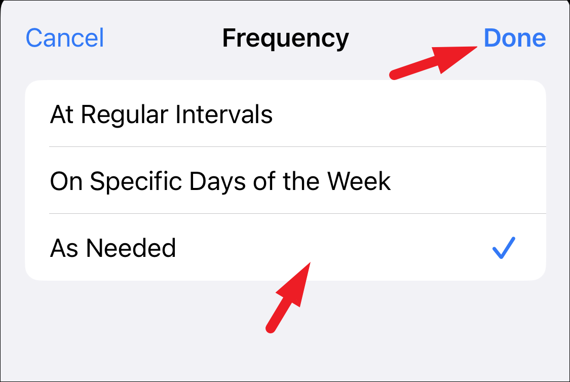 - As Needed: This option will work best for the medicines, supplements, and vitamins that you do not intake regularly but use occasionally. You will not get a reminder for medications marked as ‘As Needed’, though you can head to the Health app and manually log them as and when required.