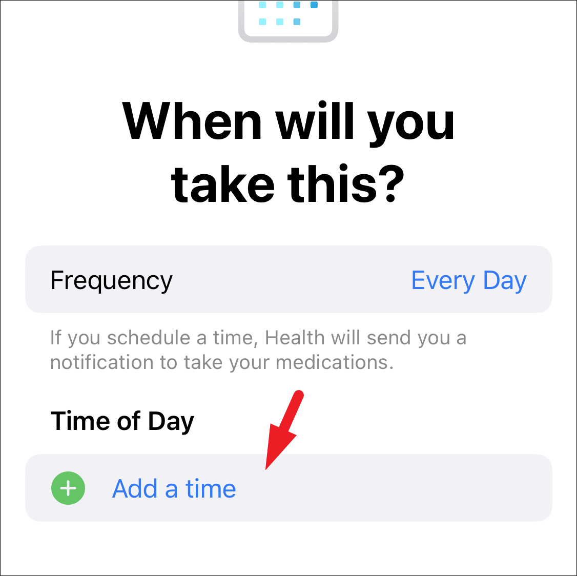 Note: If you need to take medication multiple times a day, you can add a reminder for another time by tapping on the ‘Add a time’ option present in the ‘Time of Day’ section.