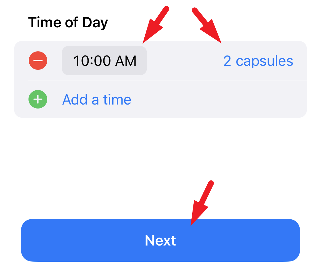 Next, tap on the mentioned time to change it according to your preference. After that, if you wish to change the number of medications, tap on mentioned quantity following the time field and type the required quantity. Once you have configured the time and quantity of the medication, tap on the ‘Next’ button present at the bottom of the page to proceed.