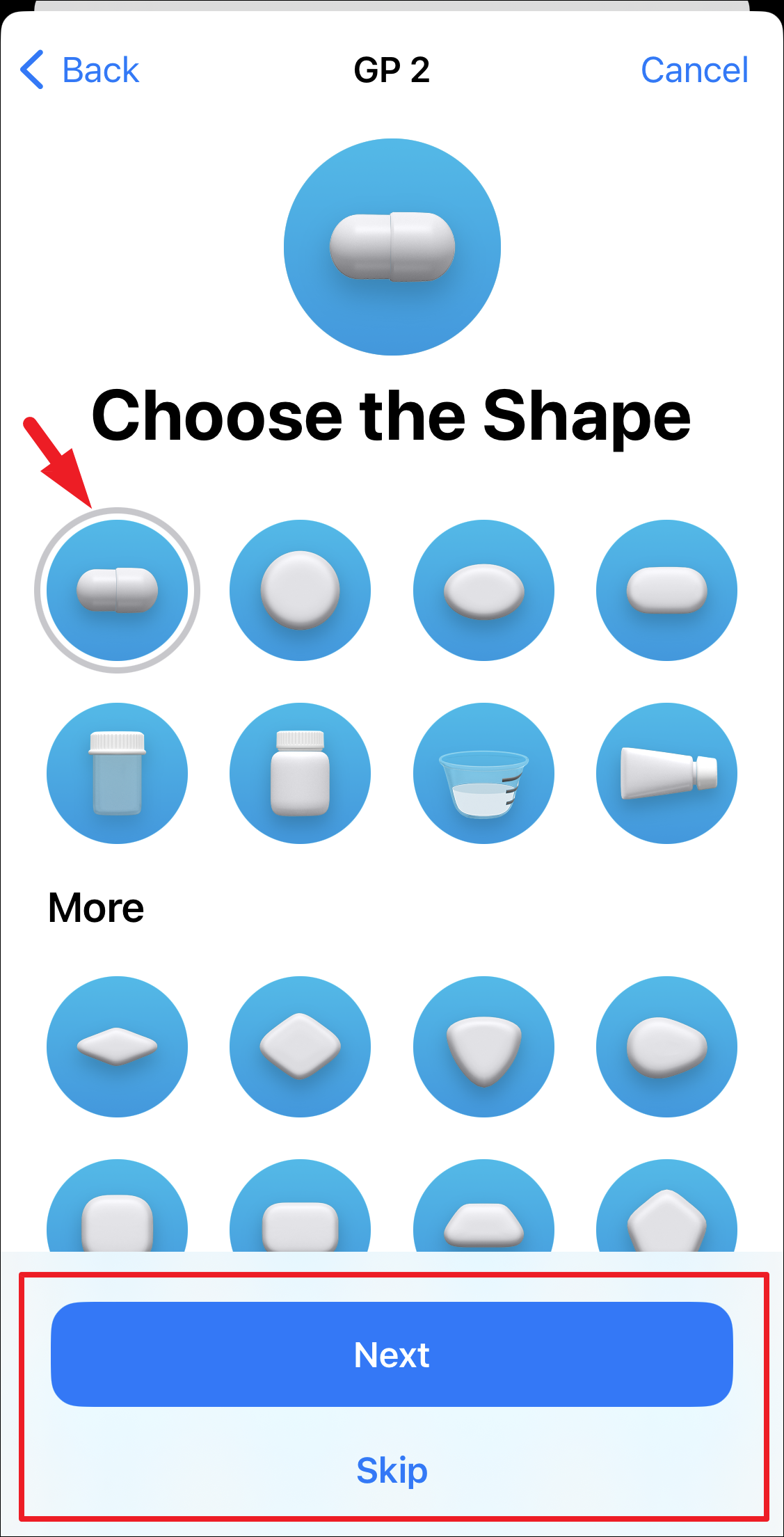 On the next page, you can choose an icon for the medication by tapping on any of the icons present in the grid. In case you do not wish to have an icon, tap on the ‘Skip’ button to proceed. Otherwise, select an icon and tap ‘Next’ to proceed.