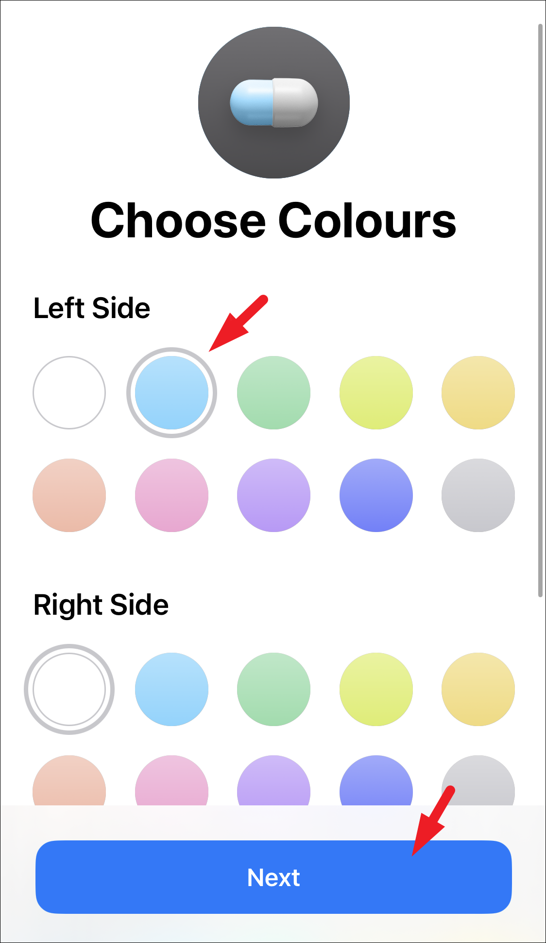 If you had chosen to display an icon for the medication, you can choose the color of the medication icon as well as the background to match the medication in real life from the color palette however you like. Once done, tap on the ‘Next’ button present in the bottom section of the window to proceed.