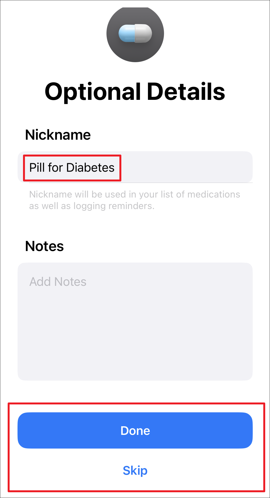 Then, finally, add a nickname for the medication entry you just created to easily identify the medication. You can also add notes for the medication, or any other information relevant to you using the ‘Notes’ section. Keep in mind these are optional details and you can completely skip this setup by clicking on the ‘Skip’ button present at the bottom of the page. If you have entered details, tap on the ‘Done’ button to add the medication and set the reminder.