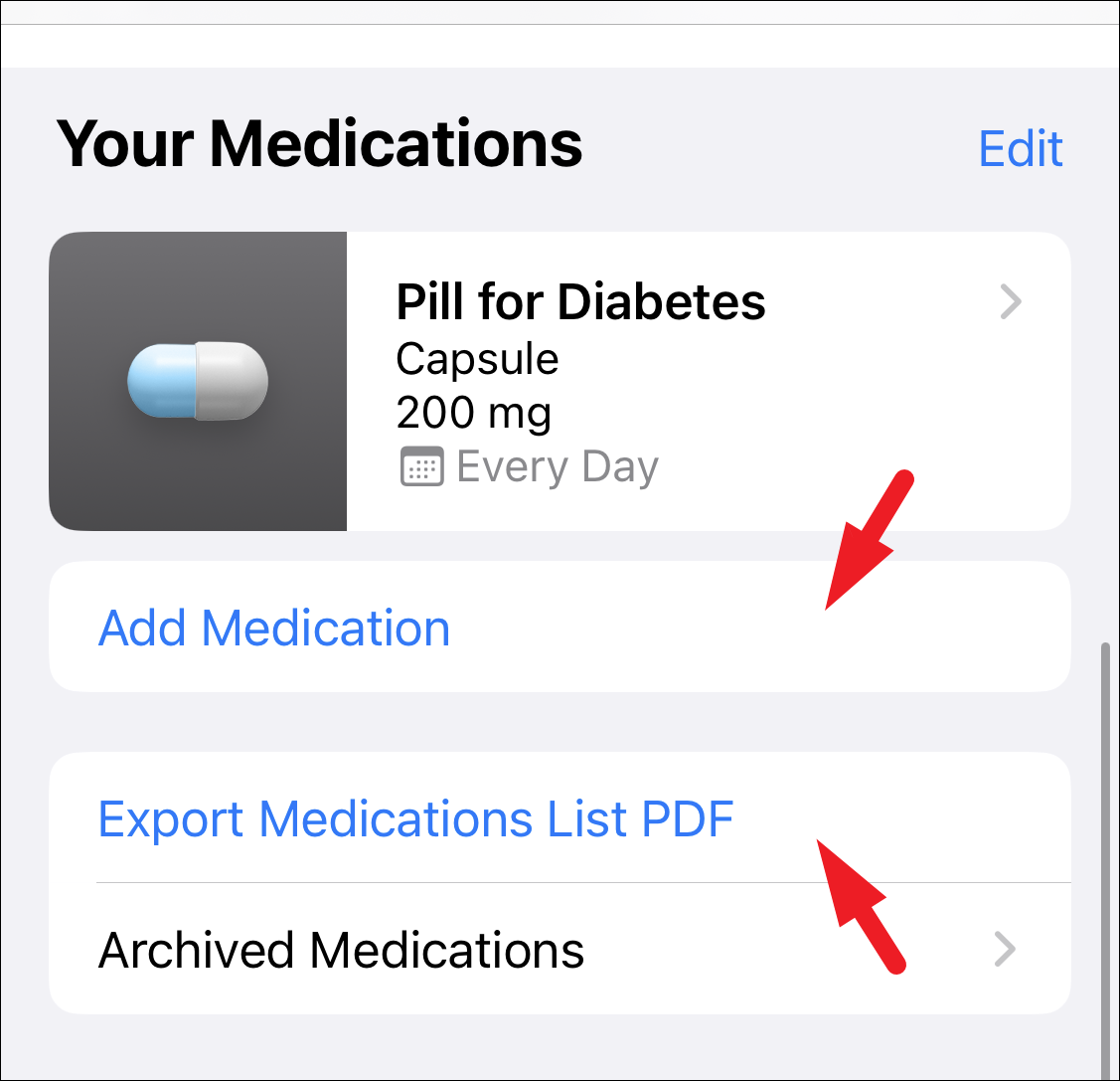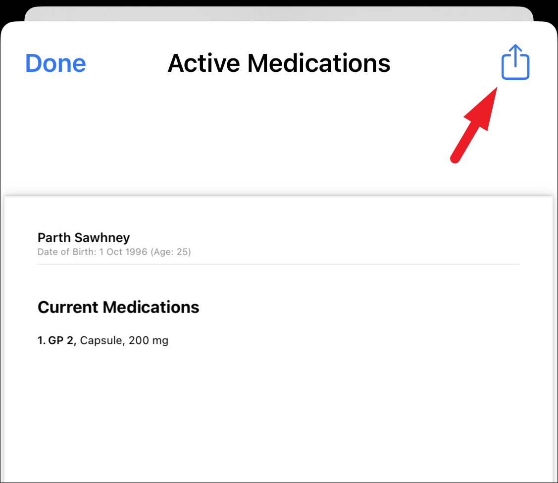 You will now be able to see all the medications that you have entered and set a schedule for under the ‘Your Medications’ section. You can also add more medication by tapping on the ‘Add medication’ button. Moreover, if you wish to see or send someone a complete list of medications that you have added to the Health app, simply tap on the ‘Export Medications List PDF’ tile to proceed. This will bring up an overlay window on your screen.