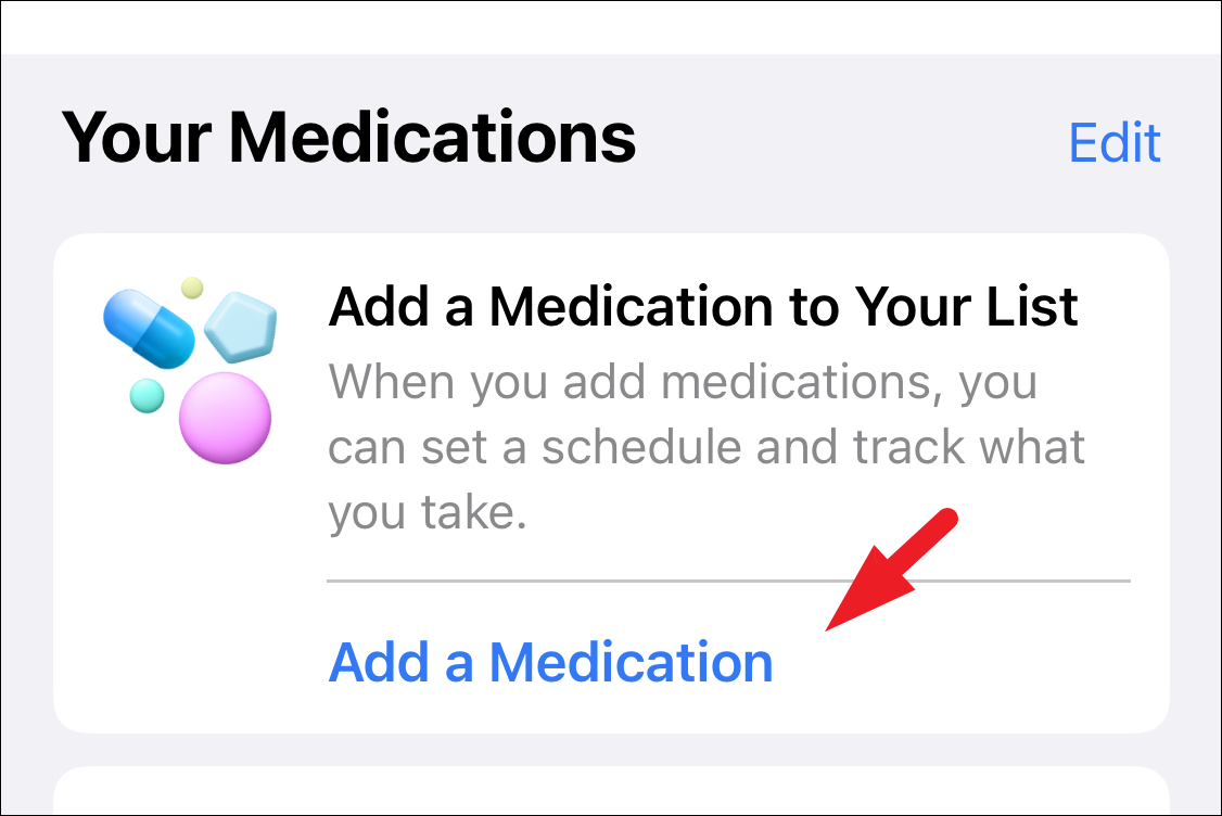 Then, on the next screen, tap on the ‘Add a Medication’ button present under the ‘Your Medications’ section to start adding a medicine, supplement, or vitamin to the health app. This will bring an overlay window to your screen.