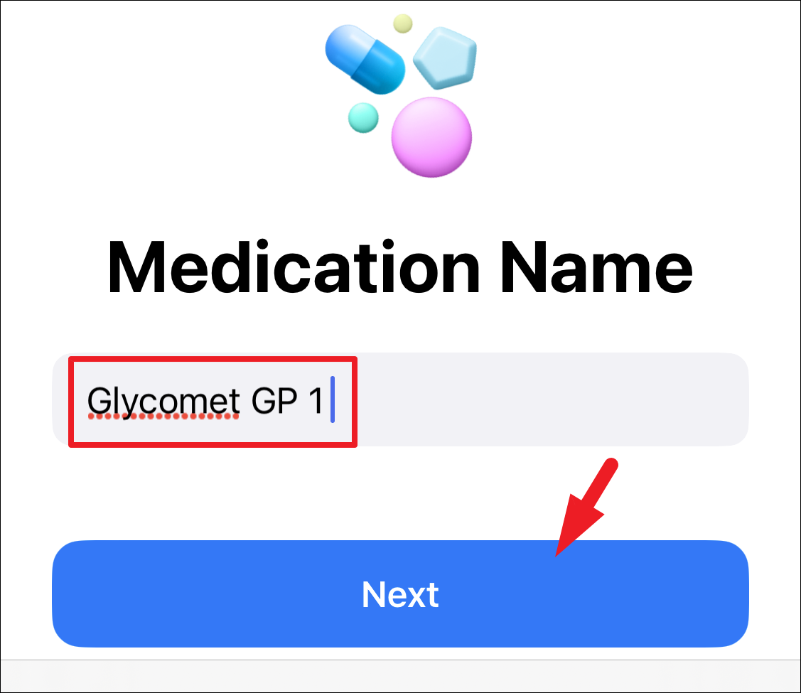 Next, enter the medication name in the text box provided and then tap on the ‘Next’ button to proceed.