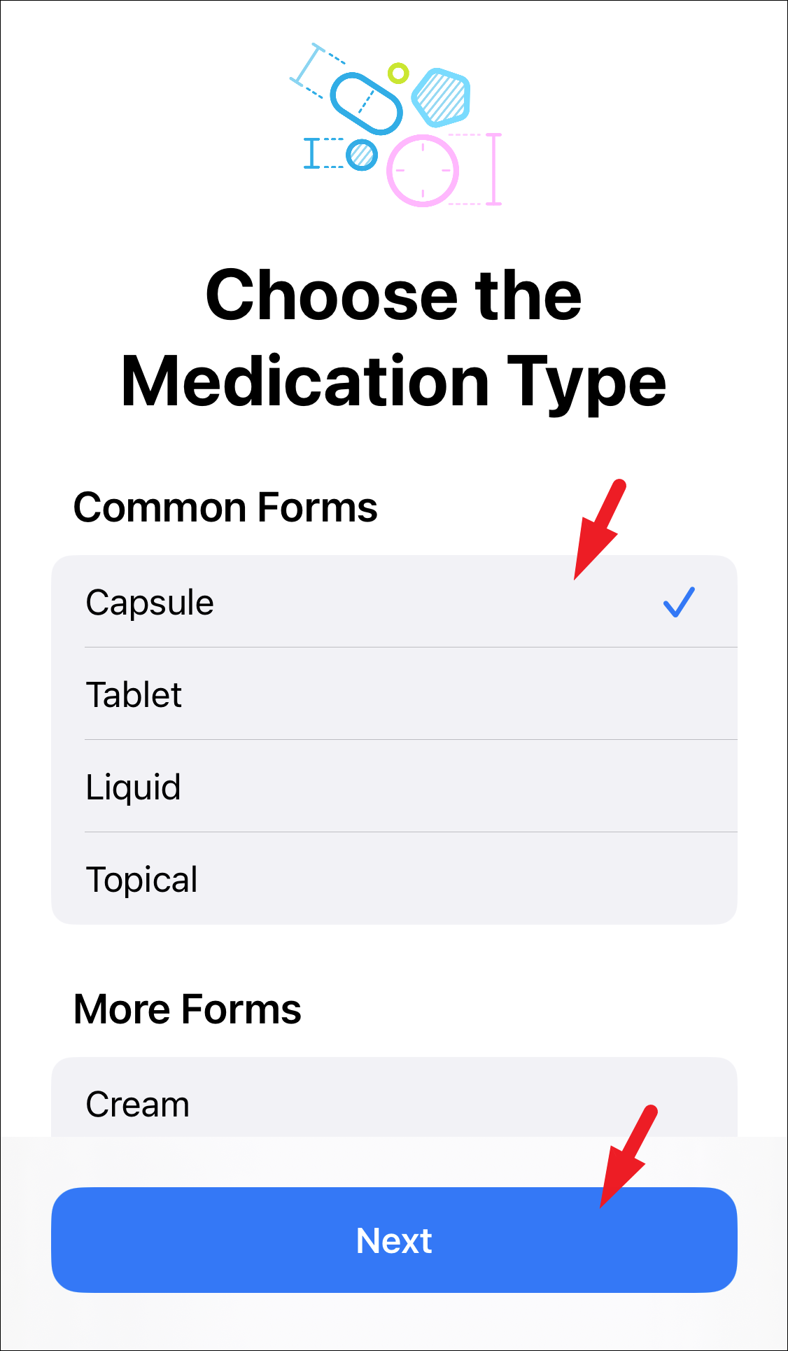On the next page, you will be required to choose the form of your medicine. Tap on the form of your specific medicine by tapping on the option from the list. After that, tap on the ‘Next’ button to continue.