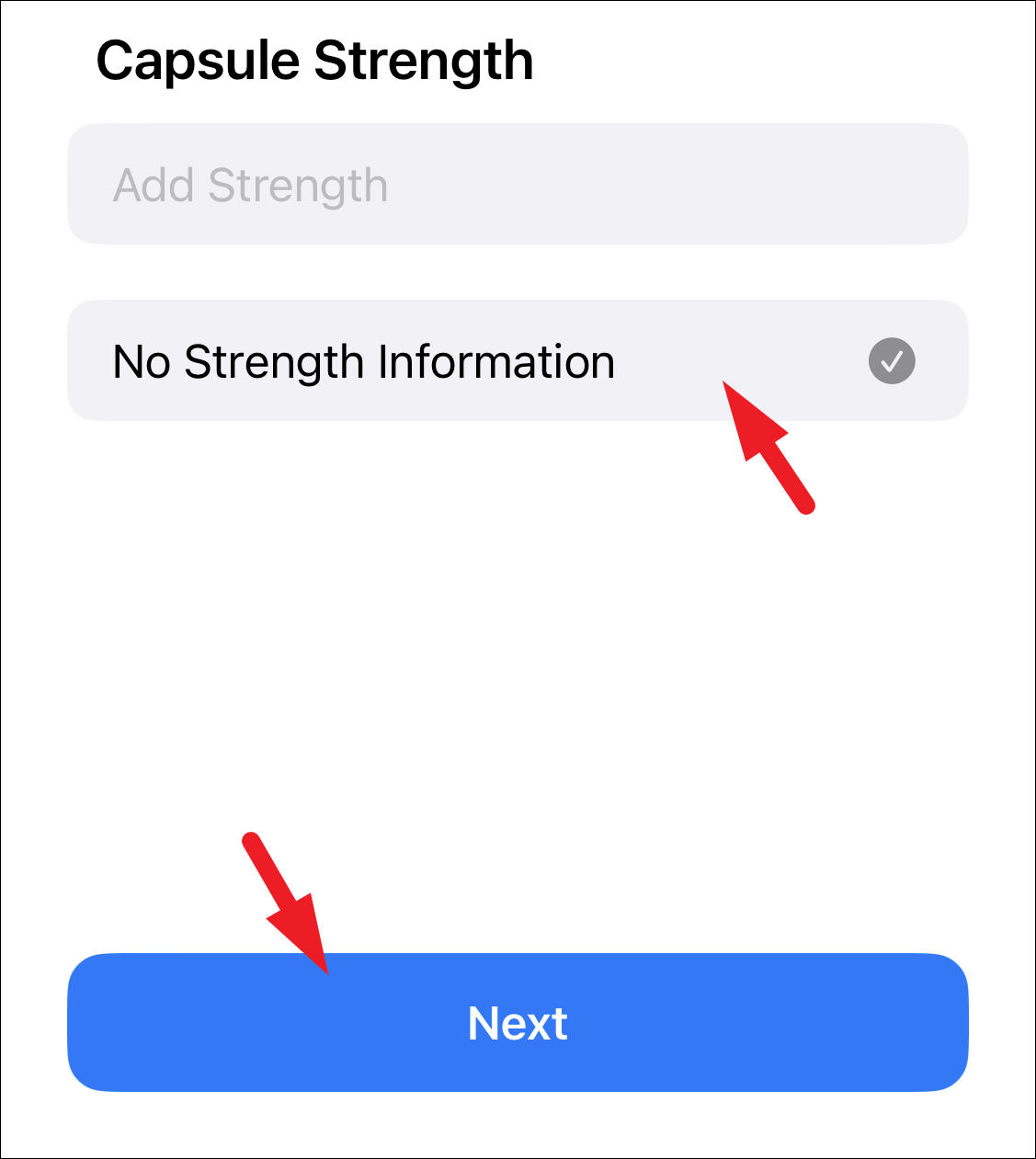 In case you do not know the strength information or it is a vitamin/ supplement that you are creating a schedule for, tap on the ‘No Strength Information’ option and then tap on the ‘Next’ button present at the bottom of the page to continue.