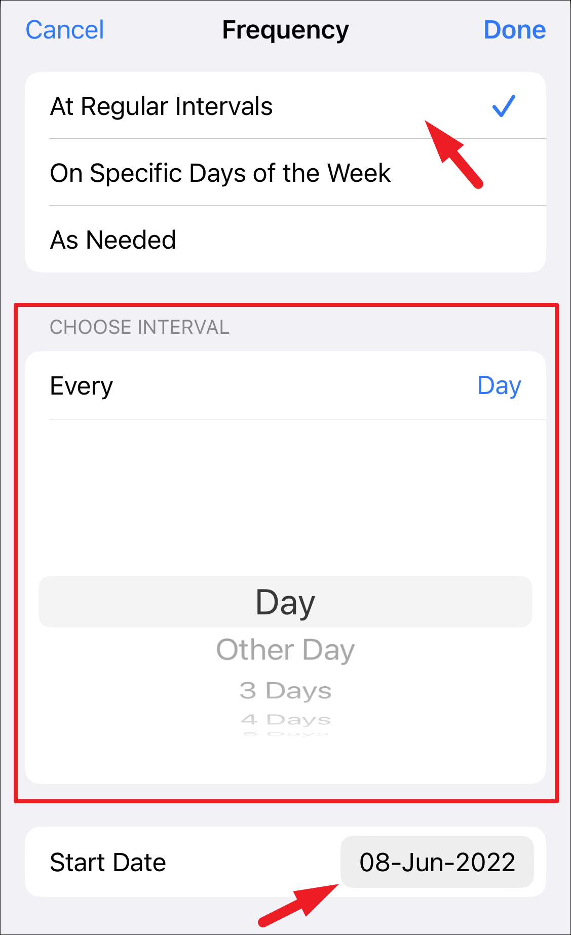If you have selected the ‘At Regular Intervals’ frequency, choose the frequency days from the ‘Choose interval’ section. After that, choose a start date for the medication by tapping on the date tile present right beneath it.