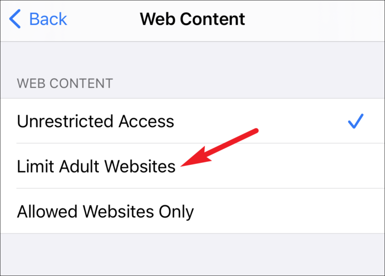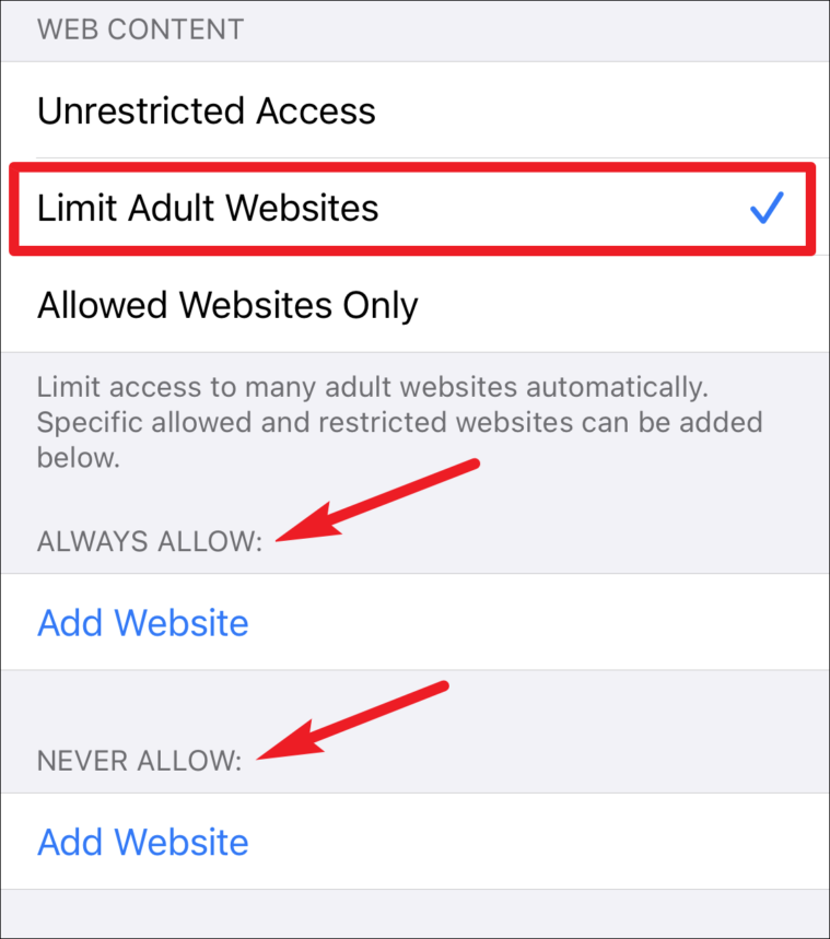 With the first option, your device will automatically limit access to many adult websites. But you can add additional websites you want to restrict or allow under ‘Always Allow’ and ‘Never Allow’ options.
