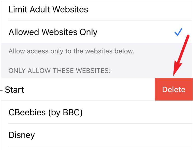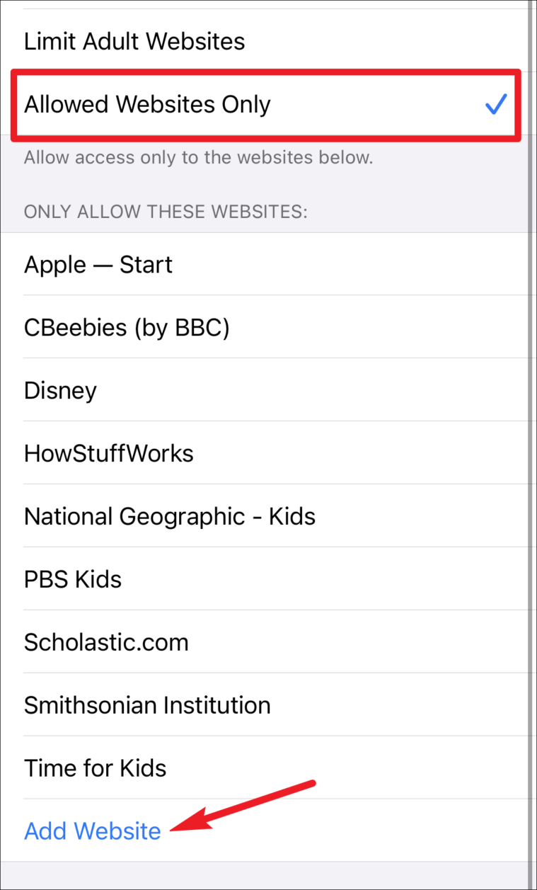 With the ‘Allowed Websites Only’ option, there is a pre-approved list of websites from which you can add or delete websites. This option is great when you’re letting very young children use the device. Tap ‘Add Website’ to add a site to the list.