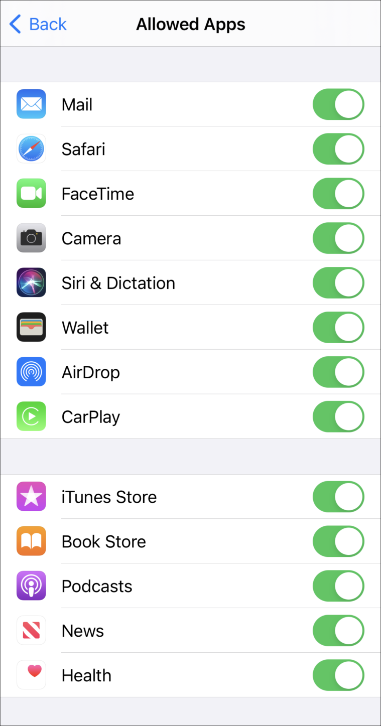 The list of built-in apps and features that you can restrict access to will appear. Turn off the toggle for the app(s) you wish to.