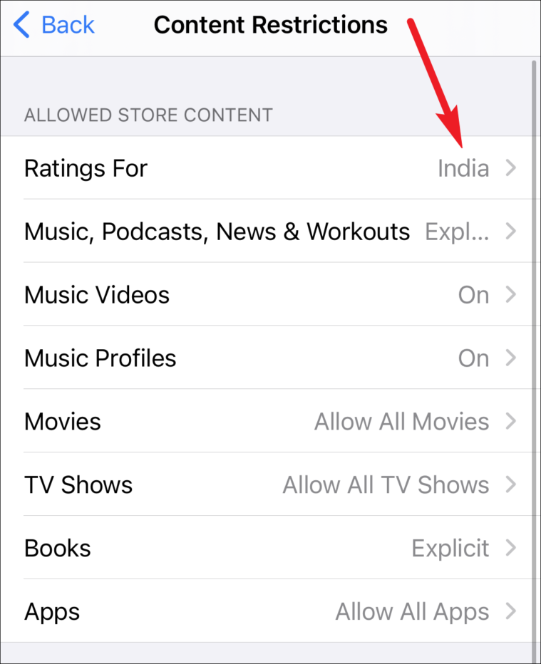 Here, you can choose the content you want to allow from the iTunes store and the ratings too. Ratings for different titles are applied according to the region selected. You can change the preferred region and select the country you want to apply the ratings for to all content in the store. Other types of content you can choose ratings for involves Music, Podcasts, Music Videos, Music Profiles, Movies, TV Shows, Movies, Books, and Apps. Select each option and then select the preferred setting for each.