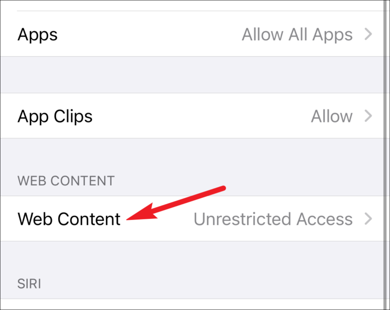 From the Content Restrictions screen, scroll down and tap ‘Web Content’.