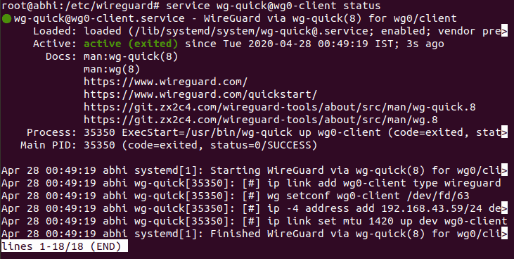 service wg-quick@wg0-client startStep 5: Verify that the client service is running: